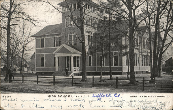 Front: 5228 Suffolk Co. PUBL. BY HEFFLEY DRUG CO. stillo! here is where I hows there and the place hold for th. How is schools etc! I likes HIGH SCHOOL, ISLIP L.I. my work too Back: SLIE SEB 25 Miss Lillie Robb, 42 Center, St Ancontai. m.y.