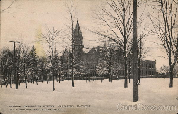Front: 10 NORMAL CAMPUS IN WINTER, YPSILANTI, MICHIGAN. MAIN BUILDING AND NORTH WING. 111 Back: Published by Chas. F. Gee, Ypsilanti, Mich. Printed in Germany 10 : United States and: Canada One Cent.: 141648 /So کی