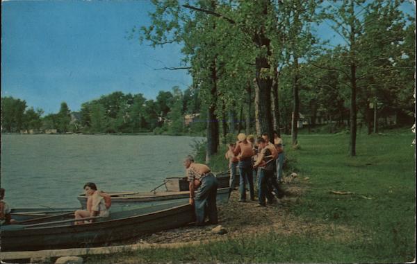 CAMP ALEXANDER MACK ON BEAUTIFUL LAKE WAUBEE Milford, Indiana A group of campers set out on a Discovery Hike in the rowboats at Sunset Beach. KOLORVUE by Artvue Post Card Co., 225 Fifth Ave., New York, N. Y. 13587