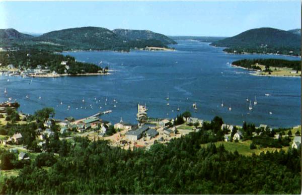 From the Waterfront at Manset, Maine, a superb view, across the entrance to Southwest Harbor, shows the entrance to Somes Sound, the only Flord on our Atlantic Coast, the southern slopes of the Mount Desert Hills, and the Coast Guard Station, on Clark Point, at left. |