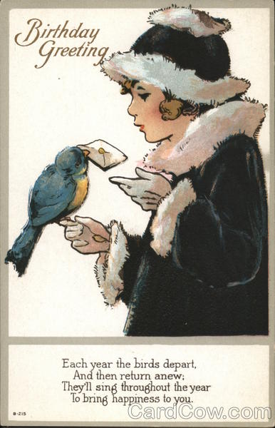 Front: Birthday Greeting 8-215 IN A HIN Each year the birds depart, And then return anew; They'll sing throughout the year To bring happiness to you. Back: 70 ADDRESS