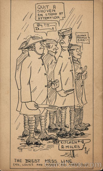 Front: QUIT A SHOVEN AN STAND AT ATTENTION @?-X. D. THE BREST (YES, LOUIE'S AND Motowy 1 SUNNY FRANCE BAH-' KITCHEN 4 2 MILES مجھے MESS LINE MAJOR'S FED THERE TOo) Back: Th Frends James I had to take 20 ne Care of them. once m while. 6.00