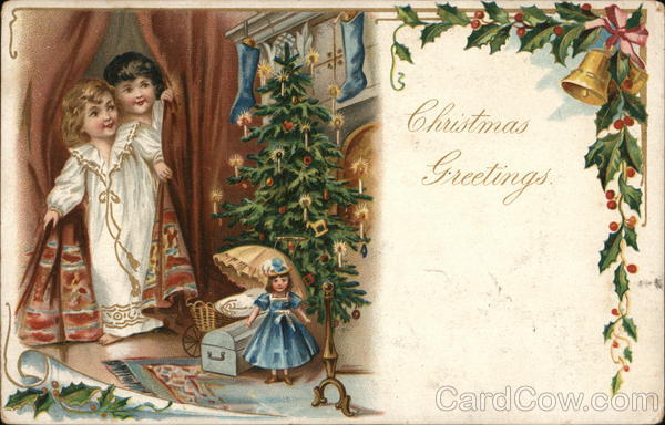 "Christmas Greetings" - Children Peer At Tree From Behind Curtain