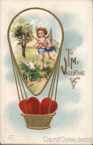 Balloon with Cupid Chasing Bird with Net and Two Hearts in Basket