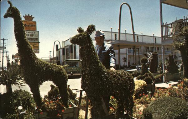 | Telephone Area Code (714) 778-1880 Put Yourself in Our Space Giraffe, Llama and Juggling Seal in the background shown with Mr. Al Stovall, who has created and hand-sculpted hundreds of these animals from plants that make up the wonderful Wonderland of Topiary Trees Gardens, all here at the Inn, all just for your pleasure. |