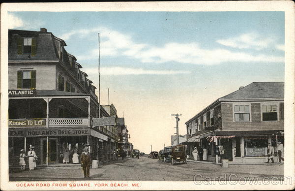 Front: ATLANTIC ROOMS TO LET DA HOLLAND'S DRUG STORE. OCEAN ROAD FROM SQUARE. YORK BEACH, ME. SOUVENIRS Back: Mfd. by Tichnor Bros., Inc., Boston, Mass. РТЗ 32 TWO CENTS