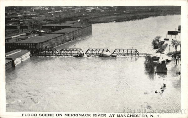Front: MAL ILLE FLOOD SCENE ON MERRIMACK RIVER AT MANCHESTER, N. H. Back: PRINTED BY TICHNOR BROS. INC., 160 NO. WASH. ST., BOSTON, MASS. FOOD CEME ON WEE PT 5.2 S