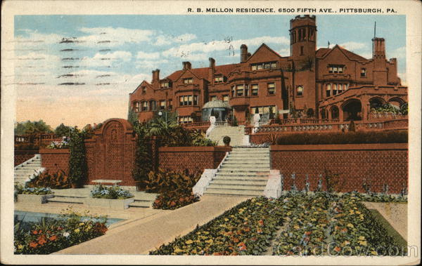 Front: 11 *** R. B. MELLON RESIDENCE, 6500 FIFTH AVE., PITTSBURGH, PA. LI ECT Back: PITTSBURGH PROMOTES PROGRESS. BURGOSTEARE TS A-47129 FLS 201 23-AM 1924 Pleanty of Winter aut RD NI'S. отя др Дижен 215 Hickory It Hallidaysburg 200