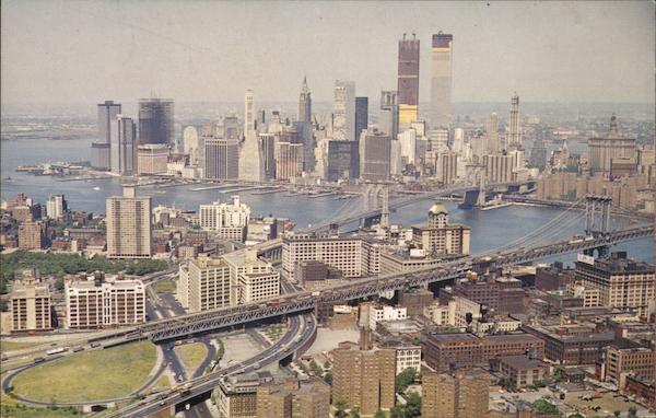 Front: VIVANVANVE FERIEN Paname. Back: Aerial view of lower Manhattan and a section of Brooklyn, showing the several groups of buildings that house the Watchtower Society's facilities here. No. 1 HERE