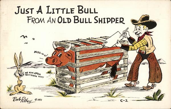 Front: JUST A LITTLE BULL FROM AN OLD BULL SHIPPER MOO-O.O! HE KIN SPELL BETTER'N THAT Bob Pettey €1951 WAS KAY C-2 9 Back: Pitley LAFF CARD DISTRIBUTED BY COLUMBIA, 7250 MELROSE, HOLLYWOOD, CALIF. 620
