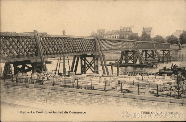 Front: Liége - Le Pont (provisoire) du Commerce Edit. O. V. S. Bruxelles Back: POSTKAART Côté réservé à l'adresse. Zijde voor het adres alleen calente for 7. Sindels Plout bretti ja E. Sezubehre dresses