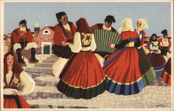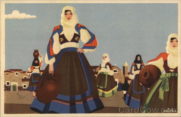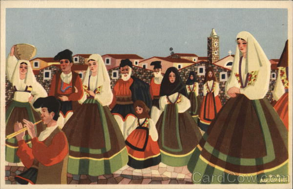 Front: BAKISFIGUS, D Back: COSTUMI SARDI- Filatrice ED. GARAMI rag. Garanzini - Milano Tempera di Bakisfigus Stampato in Italia