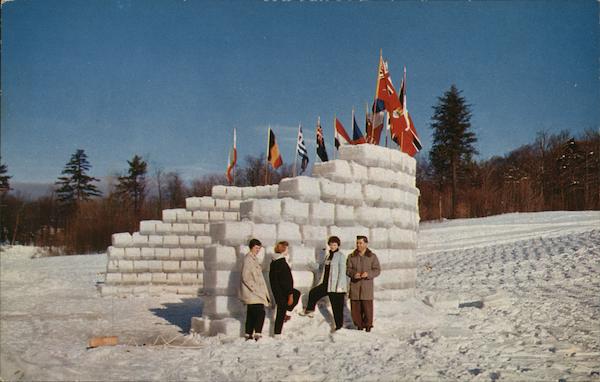 The annual Old Forge Winter Carnival revolves around the ice Palace. Constructed of large blocks of Lake Ice and bedecked with colorful flags, it is the scene of the crowning of the Carnival King and Queen. This affair, held at night, is a dazzling spectacle. The Palace, reflecting a myriad array of colored spotlights and the participants, in gala costumes, make a scene long remembered by the winter visitor. Central Adirondack Mts., N.Y. Koppel Color Cards |