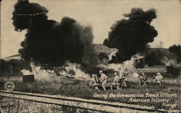 Front: THE CHICKE DAILY NEWS C Giving the Germans Gas, French Officers American Infantry Frange Back: THE CHICAGO DAILY NEWS G. J. KAVANAUGH WAR POSTAL CARD DEPARTMENT U&U Wil F