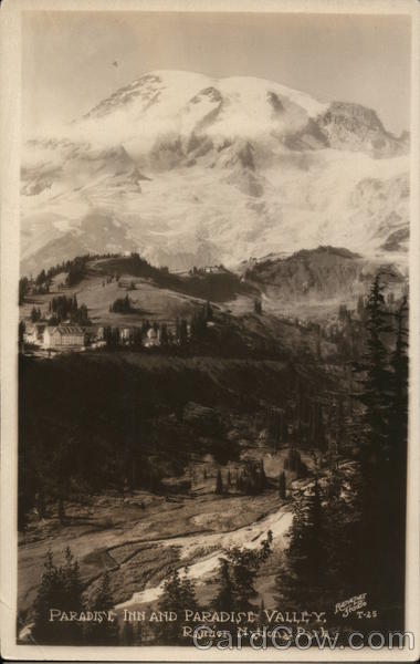 Front: PARADISE INN AND PARADISE VALLEY, Rainier National Park Ranapar Stadio T-25 Back: 6- A PLAG = STAMP HERE