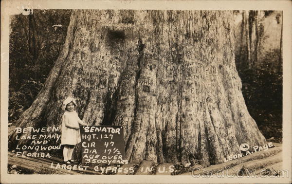 Front: SENATOR HgT. 127 CIR 47 DIA 171/2 AGE OVER 3500YEARS LARGEST CYPRESS IN U.S. BETWEEN LAKE MARY LONgwood FLORIDA LEON.A.PAge Back: NOKO NOKO