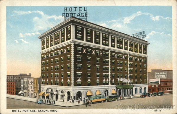 Front: 日ORTAGE T了3页7 ゴ 5 一MIROSE FURNITURE art HOTEL PORTAGE, AKRON, OHIO. 101416 日宜 面台 Back: MADE IN USA C. T. AMERICAN ART PUBLISHED BY THE SUMMIT DRUG CO., AKRON, OHIO. COLORED ko Co CHU