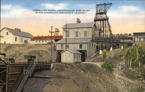 "In the Minnesota Arrowhead Country" Underground mining shaft houses in the Vermillion Range with 13,000,000 tons known deposits of red iron ore, is one of Minnesota's three greatest iron ore ranges located within Arrowhead Country. The deepest mine shaft descends to a depth of about 1,300 feet. Minnesota's great iron ore mining industry was born here over fifty years ago. E. C. Kropp Co. |