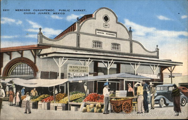 Front: PUBLIC MARKET, CUAUHTEMOC, JUAREZ, MEXICO 2211 MERCADO CIUDAD 1985. MERCADO CUAUSTEMDC. UN BUEN LIBRO ES EL MEJOR AMI60. Back: Со 13844 DISTRIBUTED BY HENRY S. BEACH, EL PASO, TEXAS-