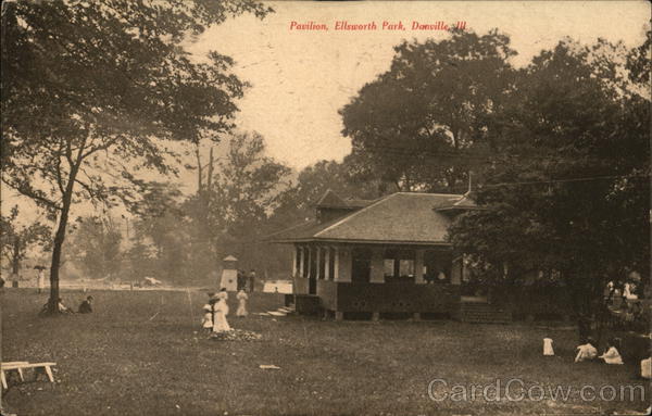 Front: Pavilion, Ellsworth Park, Danville, Ill 4: Back: NVIL POST CA JAN I 8-30P 19 10 LL helli by got card xmas was glad Gladys Busby to get it wee Ridgefarm answer suvar ONE CERTY 200