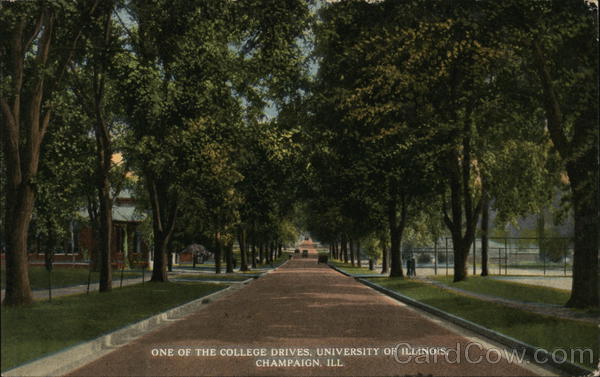 Front: ONE OF THE COLLEGE DRIVES, UNIVERSITY OF ILLINOIS, CHAMPAIGN, ILL. Back: Champagn AVALON I am on may way to chi. I guess I will land this p. M.. B. Good A-51675 C.T. PHOTOCHROM. De ܫܥܕ OX गि A7 KA Miss Garnet Busby Ridgefarm JU. 200