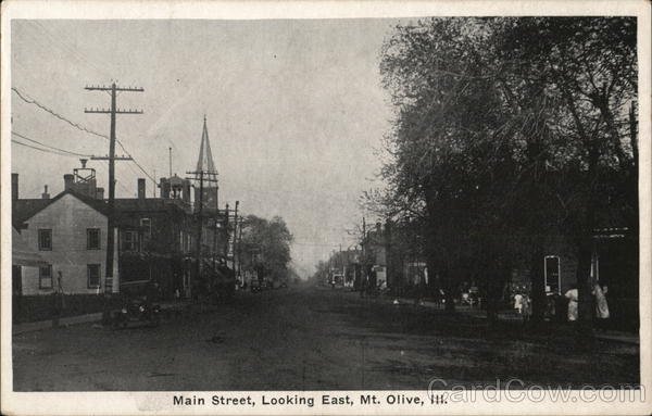 Front: ဝင်းမောင်းသူ 196 12 Main Street, Looking East, Mt. Olive, III. Back: Auburn Post Card Mfg. Co., Auburn, Ind. DOMESTIS TIVO CENTY 2,50
