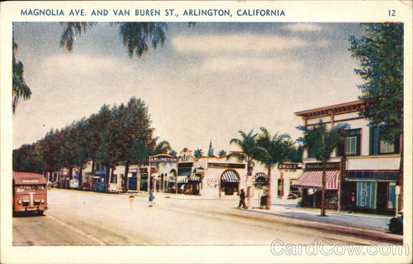 Front: MAGNOLIA AVE. AND VAN BUREN ST., ARLINGTON, CALIFORNIA LIT REPAR 12 Back: 6.00 RACK CALIF. CO., RIVERSIDE, RUBIDOUX PRINTING HERE