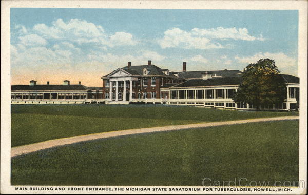 Front: MAIN BUILDING AND FRONT ENTRANCE, THE MICHIGAN STATE SANATORIUM FOR TUBERCULOSIS, HOWELL, MICH. Back: C. CAN Luzia CHICAGO R-74846 BL 2- THIS SPACE FOR ADDRESS ONLY.