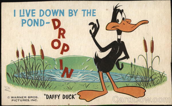 Front: 01 I LIVE DOWN BY THE POND-D ор Wh N WARNER BROS. PICTURES, INC. "DAFFY DUCK" "N Back: WARNER BROS. PICTURES, INC. What's up Doc? BUGS BUNNY FUN POST CARDS HERE