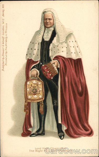 Front: The Right Hon. Lord Halsbury Lord High Chancellor 15 Published by Stewart & Woolf London. W. C. Series 105. Printed at the Fine Art Works in Prussia GJE363 200 Ca Back: d. Stamp 1d. Stamp for Abroad.