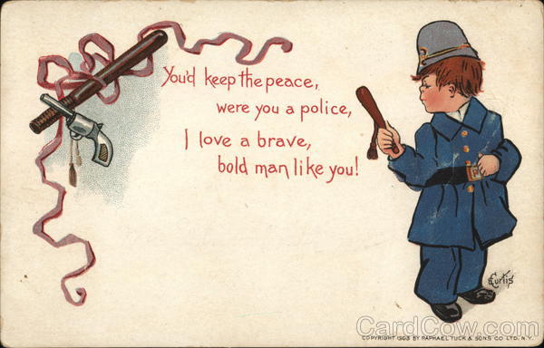 Front: 2 v You'd keep the peace, were you a police, I love a brave, bold man like you! Curtis COPYRIGHT 1903 BY RAPHAEL TUCK & SONS CO. LTD, N.Y. Back: QUI MAL 41 ARTISTIC TRADE MARK.