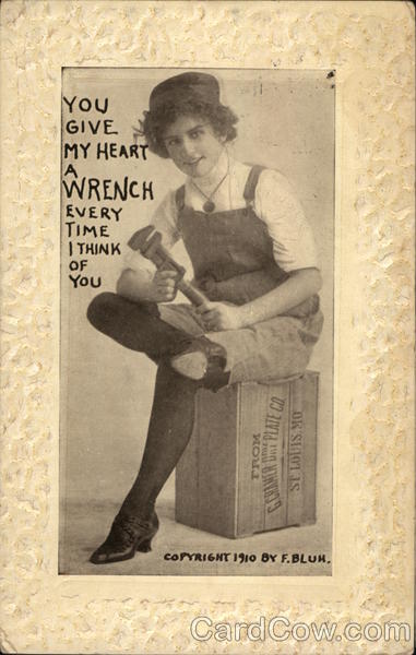 Front: GIVE MY HEART WRENCH EVERY TIME | THINK OF KONE 277 GCRAMER DRY PLATE CO. OK SINOT IS COPYRIGHT 1910 BY F.BLUH. Back: POST CARDS For Correspondence only 34 22 7 12 A 1910 Blanche wayner scid ONE CENT