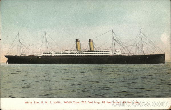 Front: White Star. R. M. S. Baltic. 24000 Tons. 725 feet long. 75 feet broad. 49 feet deep. Back: Published by Hugo Lang & Co., Liverpool. A 07266 LANG'S POST IL @CARD TO BE WRITTEN HERE. ½ d 1 d fro