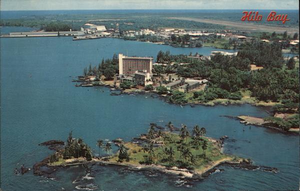 HILO BAY - HILO, HAWAII Cocoanut Island in foreground, Naniloa Hotel in middle and Hilo Wharf upper left. 25430-C dp Pub. by Modern Camera Center, 165 Keawe St., Hilo, Hawaii DEXTER PRESS, INC. WEST NYACK, NEW YORK HERE