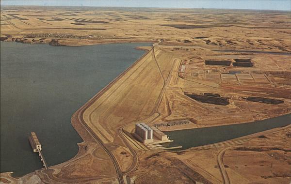 Aerial view looking west. Garrison Dam, Intake structure and powerhouse. North Dakota - 67 Montana Post Card & Souvenir Co., Box 1157, Miles City, Montana 59301 S-59787-1 HERE