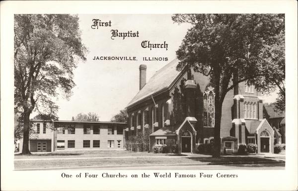 Front: First Baptist ipaniyp JACKSONVILLE, ILLINOIS 目に ■TE %3D One of Four Churches on the World Famous Four Corners Back: LITHOGRAPHED BY SPALDING PUBLISHERS, CHICAGO 20, ILLINOIS