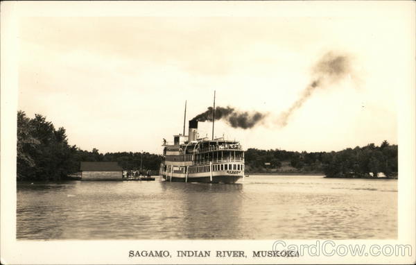 Front: SAGAMO, INDIAN RIVER, MUSKOKÄ„ Back: THATCHER STUDIO, BRACEBRIDGE, 1944 MADE IN CANADA ~VELOX A V PLACE V E. L STAMP L X HERE VELOX loee