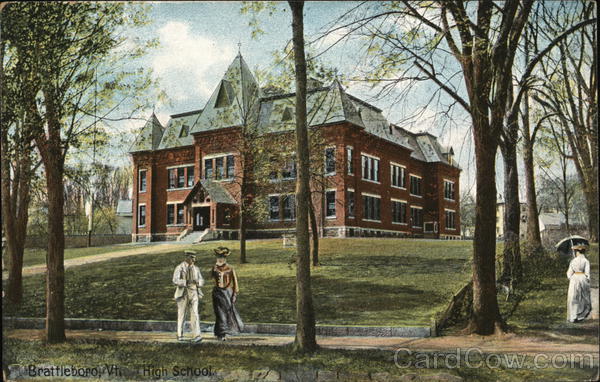 Front: Brattleboro, Vt High School 31 CL MD Back: THE HUGH C. LEIGHTON CO., MANUFACTURERS, PORTLAND, ME., U.S.A. 25400 MESSAGE MAY BE WRITTEN ON THIS SIDE. Nov. 20, 1908. from Mr. Orkins WJ and Island Possessions Cuba, Canada and For Foreign.