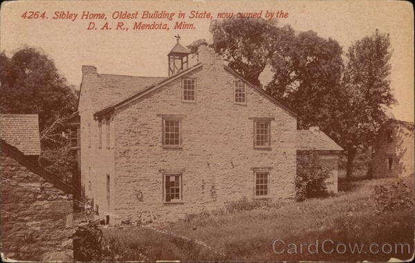 Front: 4264. Sibley Home, Oldest Building in State, now owned by the D. A. R., Mendota, Minn. Back: Pub. by The Acmegraph Co., Chicago. AND CANADA, FOREIGN, Two CENTS. at as ins