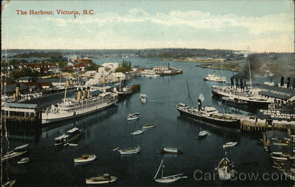 Front: The Harbour, Victoria, B.C. BURUNG Hi EEE ********* COUNTY NK PACIFIC EVANE COLEMAN EVANS H Back: Montreal and Tonings Corresponden The Valentine & Sons Publishing FAMOUS THROUGHOUT THE WORLD. MANUFACTURE 200