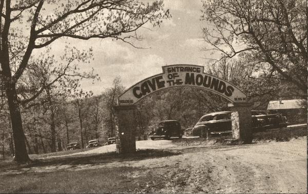 Front: ** WELCOLLE ENTRANCE front CAVERE MOUNDS. NG Back: THE OAK GROVE PARKING AREA AT THE ENTRANCE ARCH TO CAVE OF THE MOUNDS, BLUE MOUNDS, WIS. 150 PHOTO BY DIEMER, MADISON, WISCONSIN PLACE