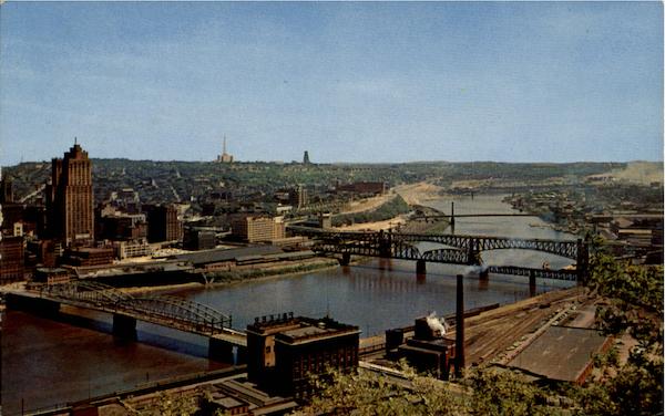 View of the Pittsburgh skyline from Mt. Washington, showing the "New" Pittsburgh and its network of bridges leading into the downtown Triangle.