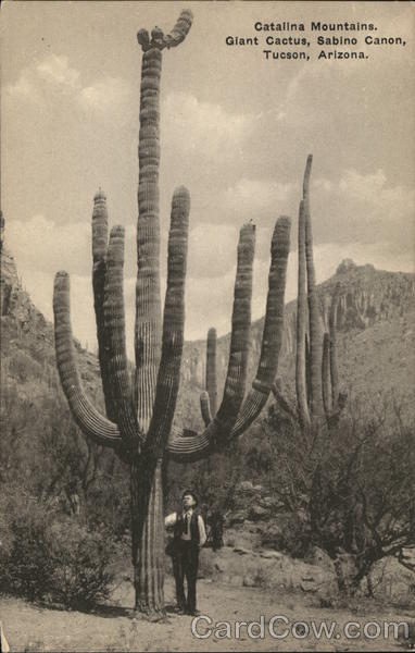 Front: Catalina Mountains. Giant Cactus, Sabino Canon, Tucson, Arizona. Back: FOR TUCSON LITERATURE CHAMBER OF COMMERCE TUCSON, ARIZONA. Copper-Cotton-Cattle-Climate كل