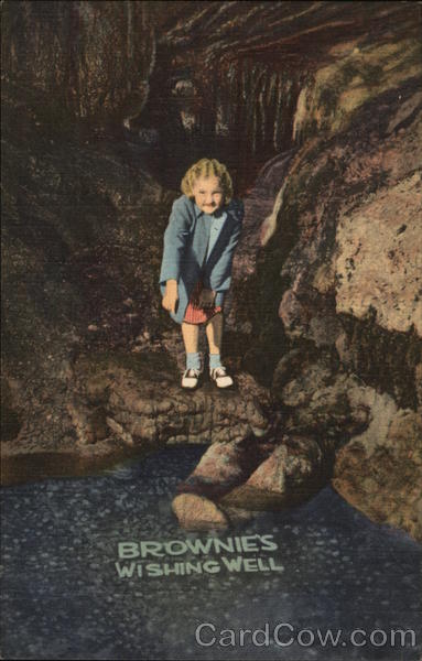 Front: BROWNIES WISHING WELL Back: BROWNIE'S WISHING WELL, CAVE OF THE MOUNDS, BLUE MOUNDS, WISCONSIN 25 Miles West of Madison, Wis. on Highway 18-151 2B-H118 GENUINE CURTEICH-CHICAGO 200