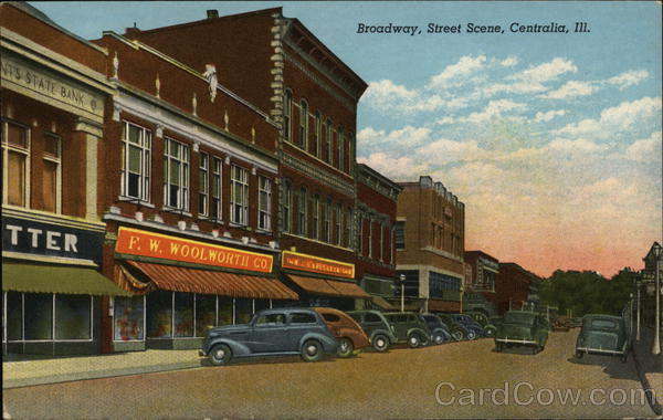 Front: Broadway, Street Scene, Centralia, Ill. NTS STATE BANK TTER F. W. WOOLWORTH CO. SEPESCEL TATS Back: SOUTHERN ILLINOIS NEWS COMPANY, CHRISTOPHER, ILL. کے لیے 9A395 -N