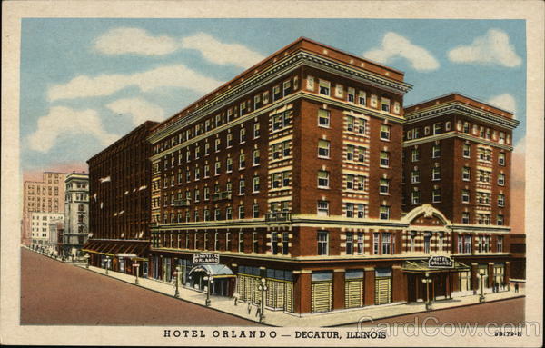 Front: EE OF CFO FELEEEEF E: HOTELL ORLANDO ORLANDO HOTEL ORLANDO DECATUR, ILLINOIS 8B179-N 18 び 00 L 发 Back: DECATUR NEWS AGENCY, DECATUR, ILL. نام (