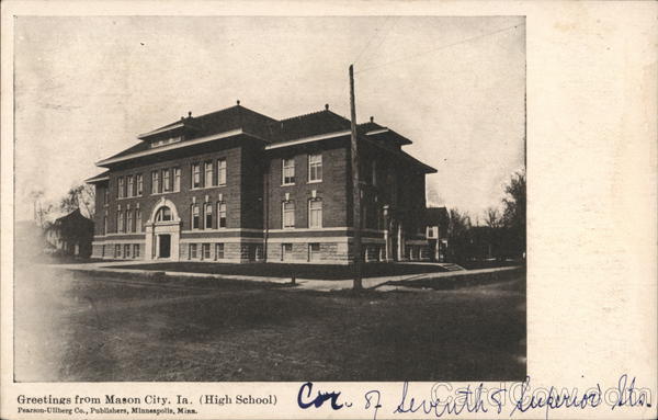 Front: Greetings from Mason City. Ia. (High School) Pearson-Ullberg Co., Publishers, Minneapolis, Minn. Coc. of Leventh & Lukeriod Its. Back: ST CARD 400 Place 1c Foreign 2c