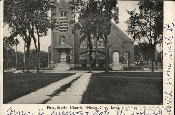 TI Corner of superior Jasopf City, Iowarto Looking First Baptist Church, Mason City, Iowa. its south from sixth St.