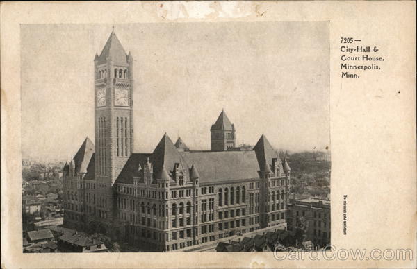 Front: Um IF II 7205-> City-Hall & Court House, Minneapolis, Minn. SOUVENIR POST CARD CO NY Q Back: Post Card- AL مد miss klue Spargles 609 & clayton St. مئے Bloomin