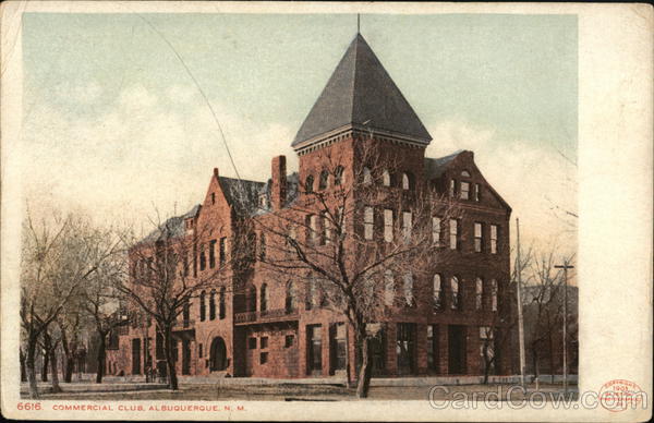 Front: 6616. COMMERCIAL CLUB, ALBUQUERQUE, N. M. 111 COPYRIGHT 1903. BY DETROIT PHOTOGRAPHIC CO Back: 100 FOREIGN. TWO CENTS